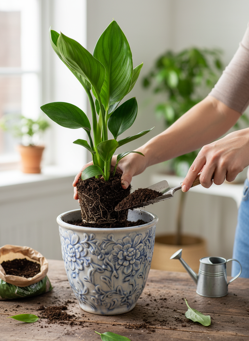 Podlewaj umiarkowanie — najlepiej, gdy wierzchnia warstwa podłoża lekko przeschnie. Unikaj stałego zastojącej wody, która może prowadzić do gnicia korzeni.
